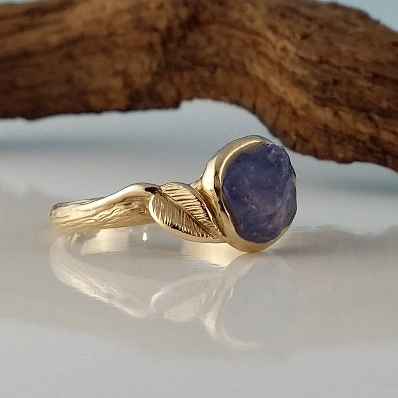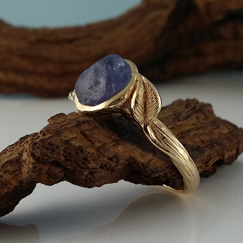 I wanted to create a beautiful yet elegant leaf and twig Solitaire using a rough uncut sapphire, so I sculpted the branch and leaves to focus on the Sapphire.
