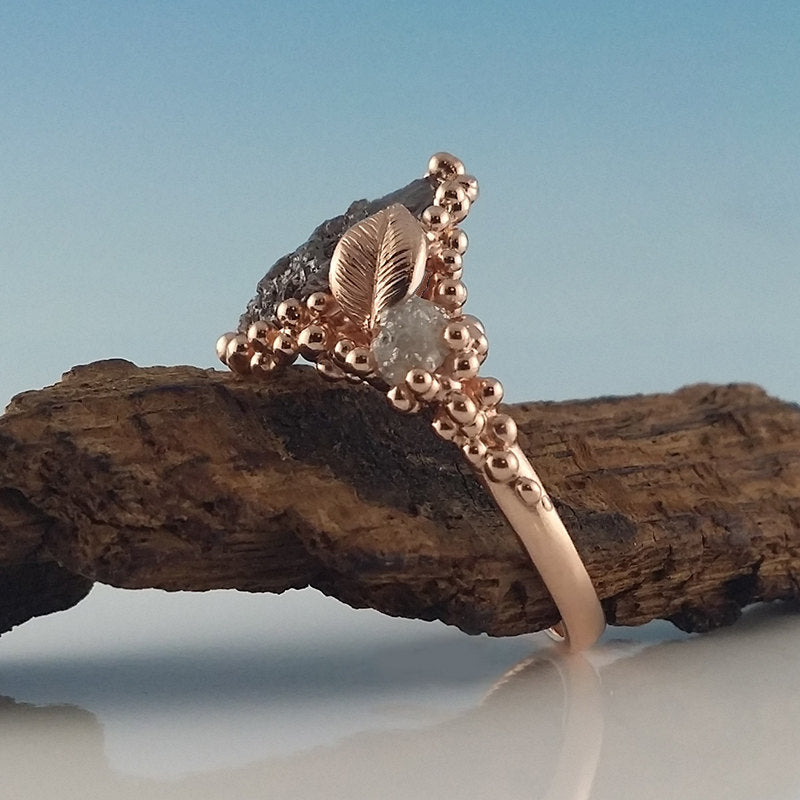 One-of-a-Kind hand sculpted Leaf and Pebble Reddish Brown Rough Diamond Engagement Ring Collection by Dawn Vertrees