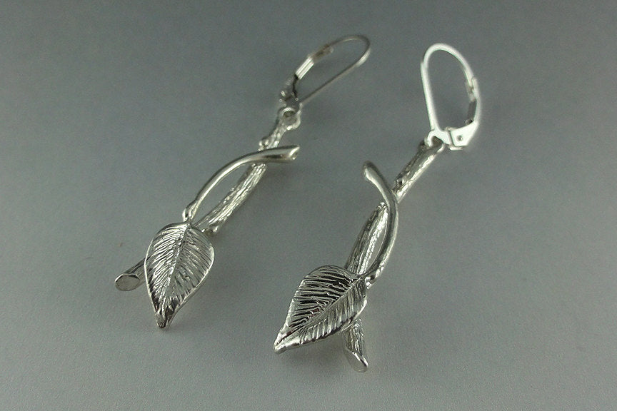 Hand sculpted Sterling Silver Leaf & Twig Earrings with tiny Buds and a Leaf perfectly balanced.