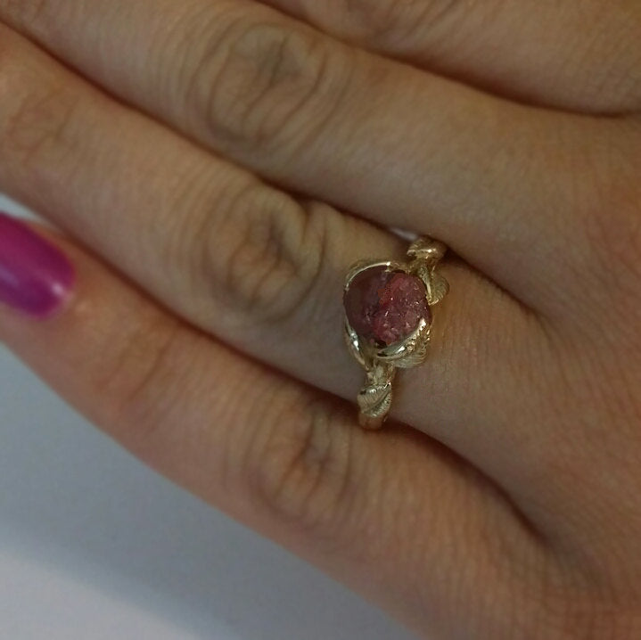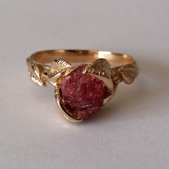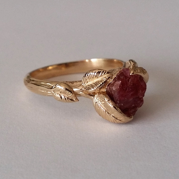 A handmade 14K yellow gold with hand sculpted ring with 6 detailed leaves with beautiful natural ruby set with a beautiful natural raw ruby.