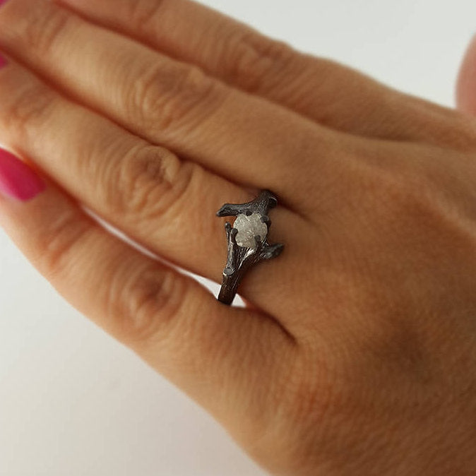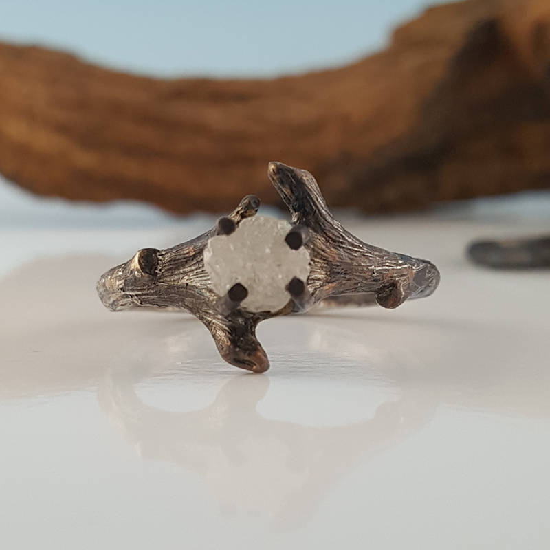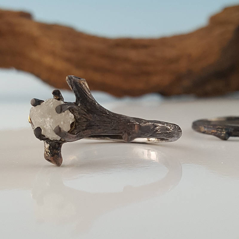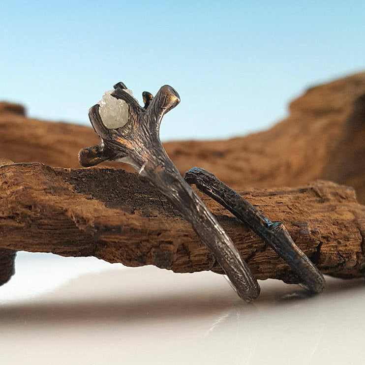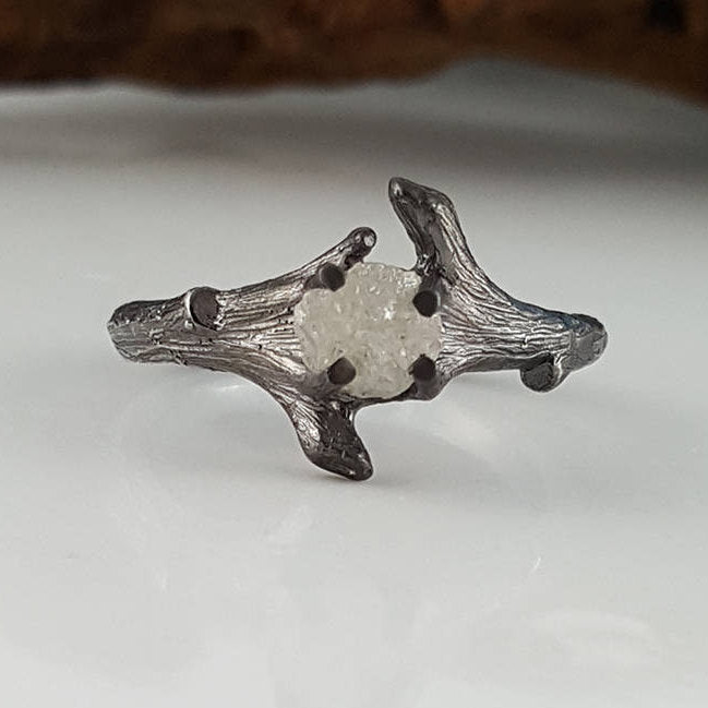 I wanted to create a beautiful yet elegant Twig Bridal Set using a Rough Uncut Diamond, so I sculpted the branch to focus on the showcasing this rough diamond.