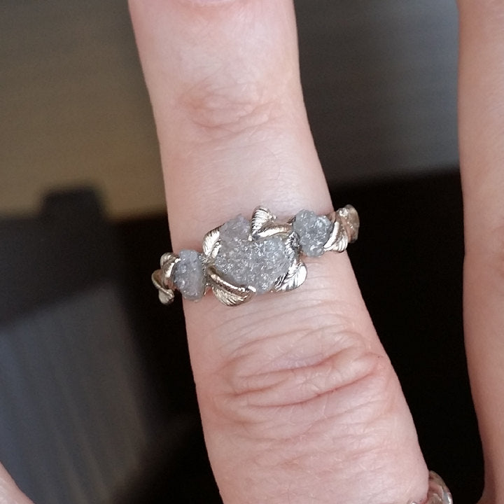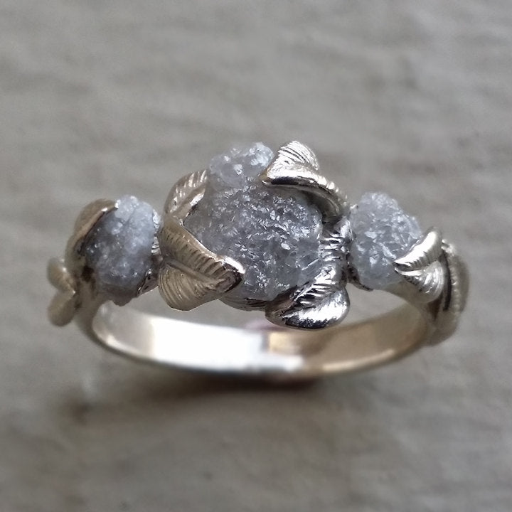 8 hand sculpted detailed leaves that wrap around 3 raw uncut rough diamonds. The leaves embrace each diamond creating a beautiful natural setting.