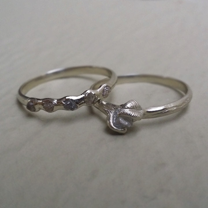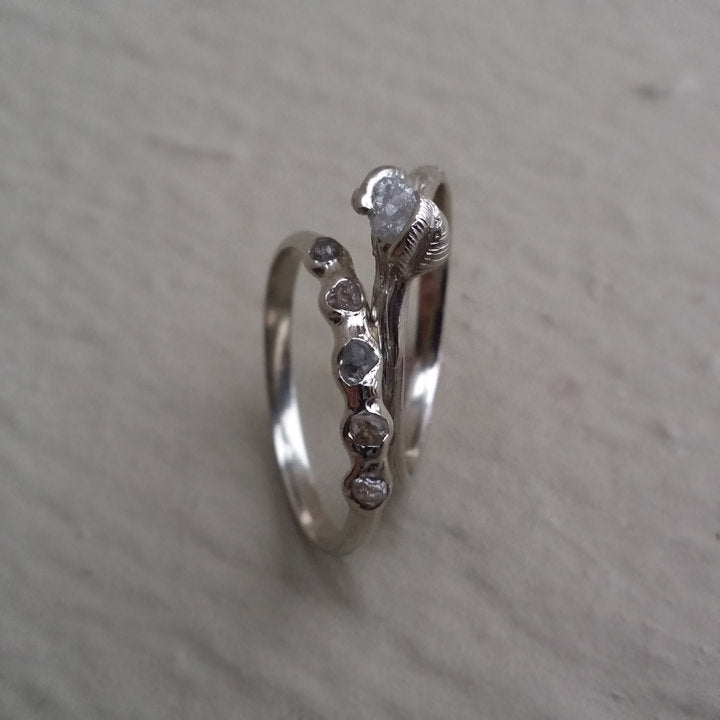 Made-to-Order Hand sculpted 14k Leaf & Twig Wedding Set. Very Pretty Raw Uncut Diamond Solitaire Engagement Ring with a Uncut Raw 5 Diamond Band. Hand sculpted One-of-a-Kind Wedding Rings.
