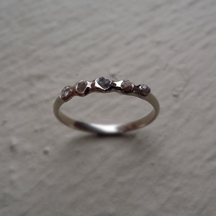I wanted to create a delicate yet beautiful Leaf and Twig Bridal Set using Uncut Raw Diamonds, so I sculpted the branch band first and then I hand sculpted two leaves along with their stems that embrace each uncut diamond as if it was two hands holding the stone. The wedding band has 5 uncut raw diamonds that span across the top and fits beautifully against the Diamond Solitaire.