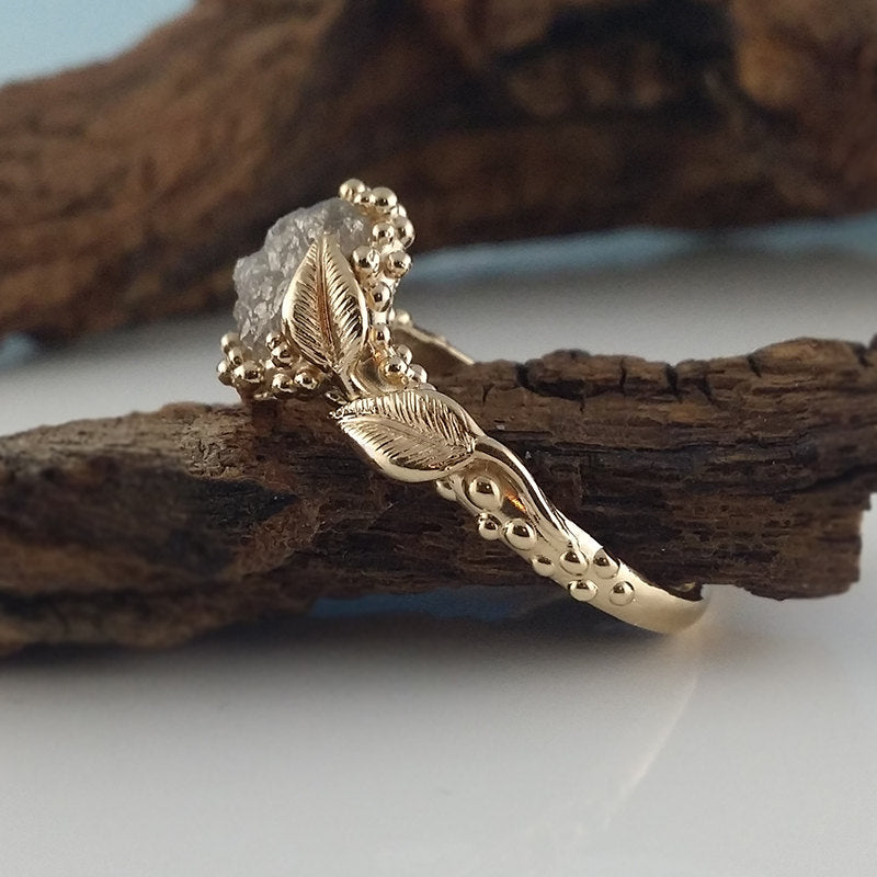 Two hand sculpted leaves with tiny pebbles scattered around the diamonds and leaves. The rough uncut diamond is 2.06 carat. A beautiful alternative engagement ring designed to easily stack.