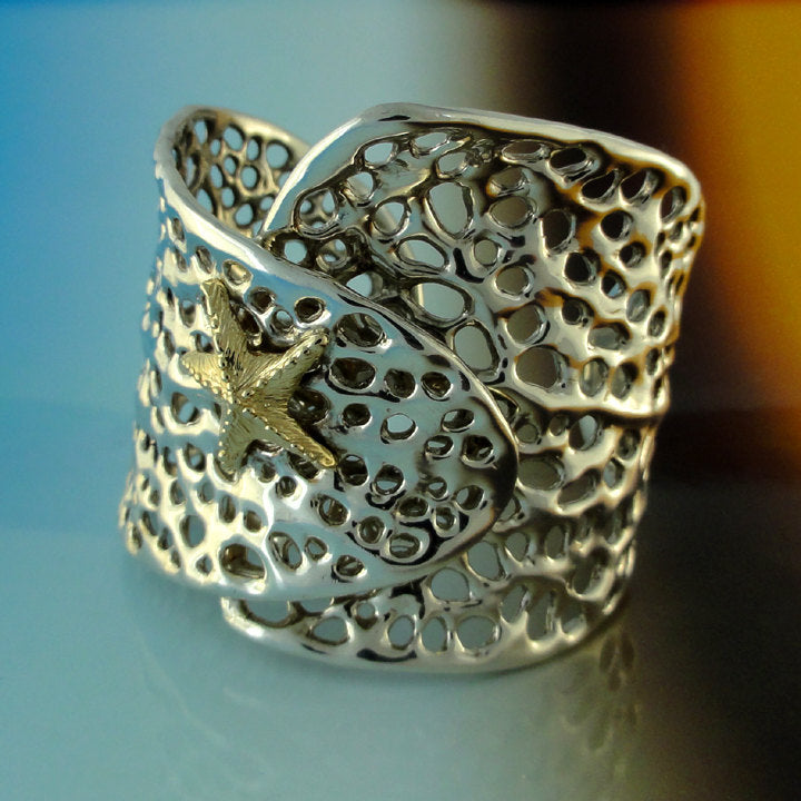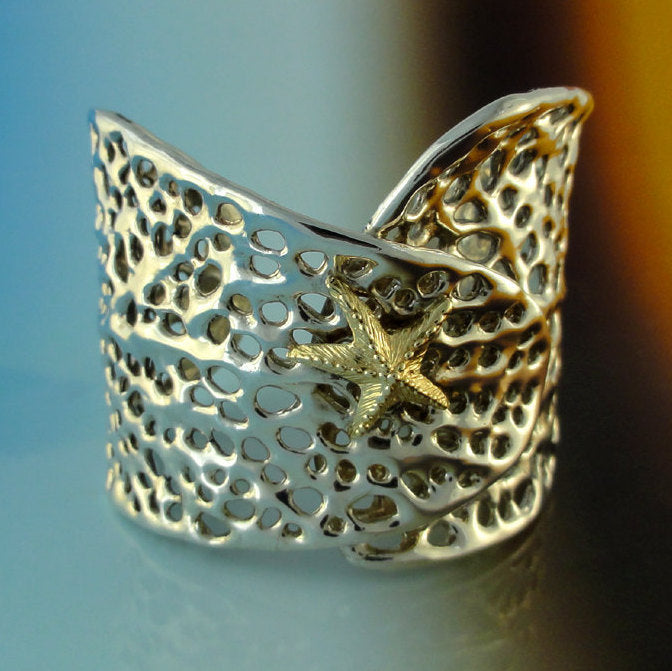 This is a hand sculpted Sterling Silver Fan Coral Cuff bracelet in Sterling Silver that overlaps itself with a large solid 14k Yellow Gold Starfish.