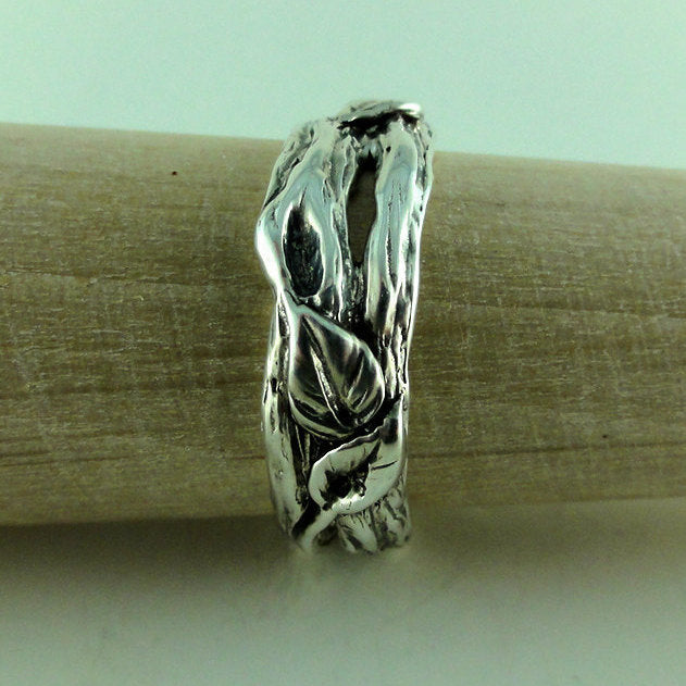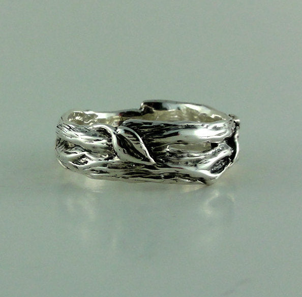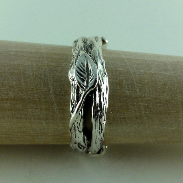 Hand sculpted twig band with 3 leaves, Continuous 360 design.