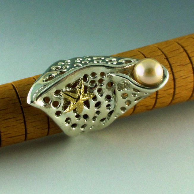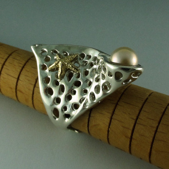 I hand sculpted the wax model in jewelers wax and then it's cast in Sterling Silver with a high polished finish. The starfish is cast in 14k Yellow Gold and the Pearl shown in the first picture is a 7.4mm Natural Emerald Green Tahitian Pearl.
