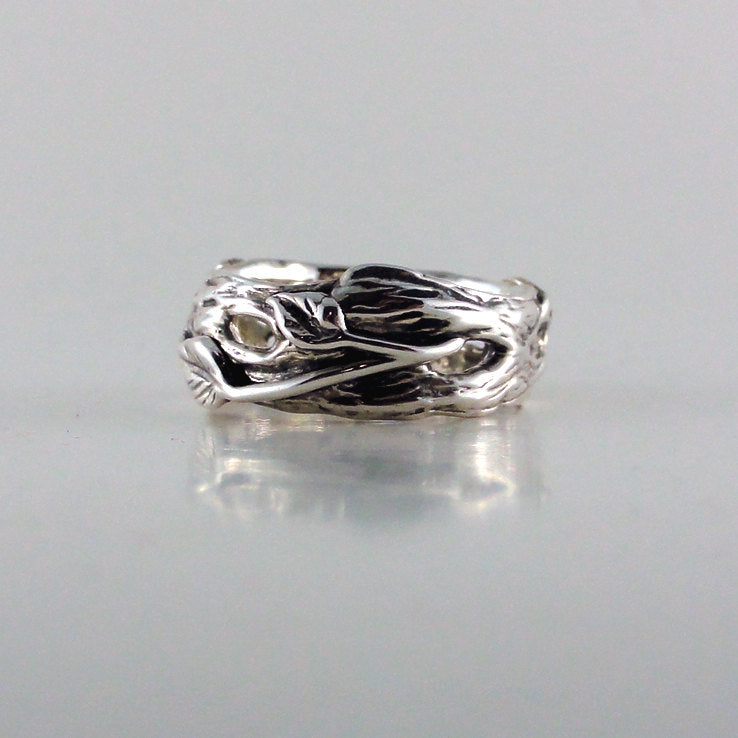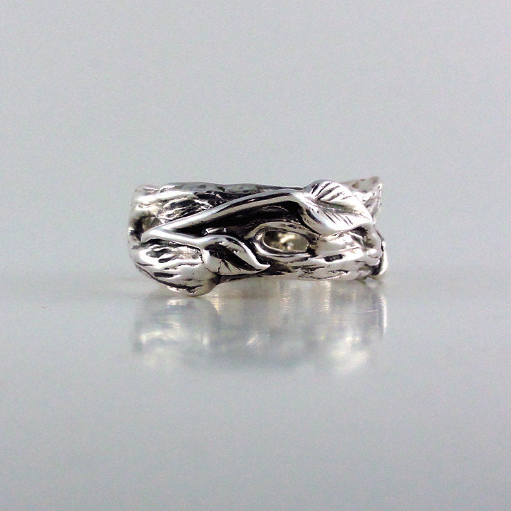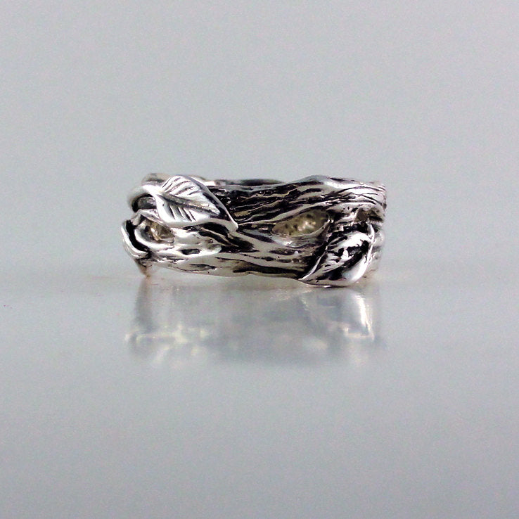 Hand sculpted twig band with 4 leaves, Continuous 360 design.