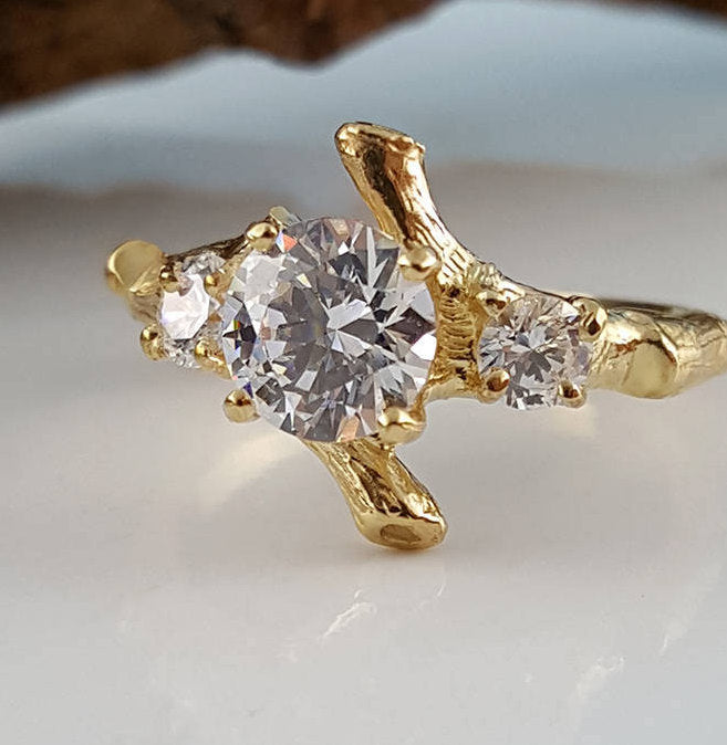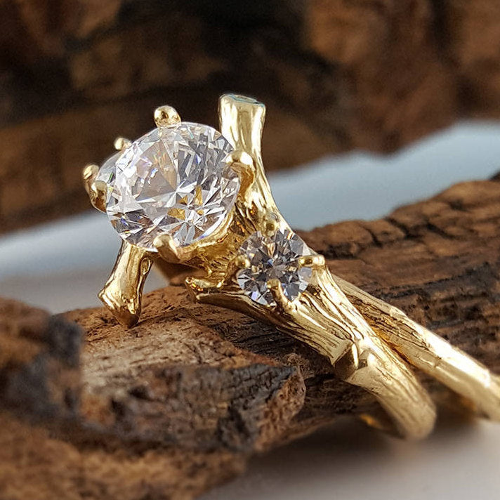 I created a 3 Moissanite diamond twig engagement set with a branch texture.