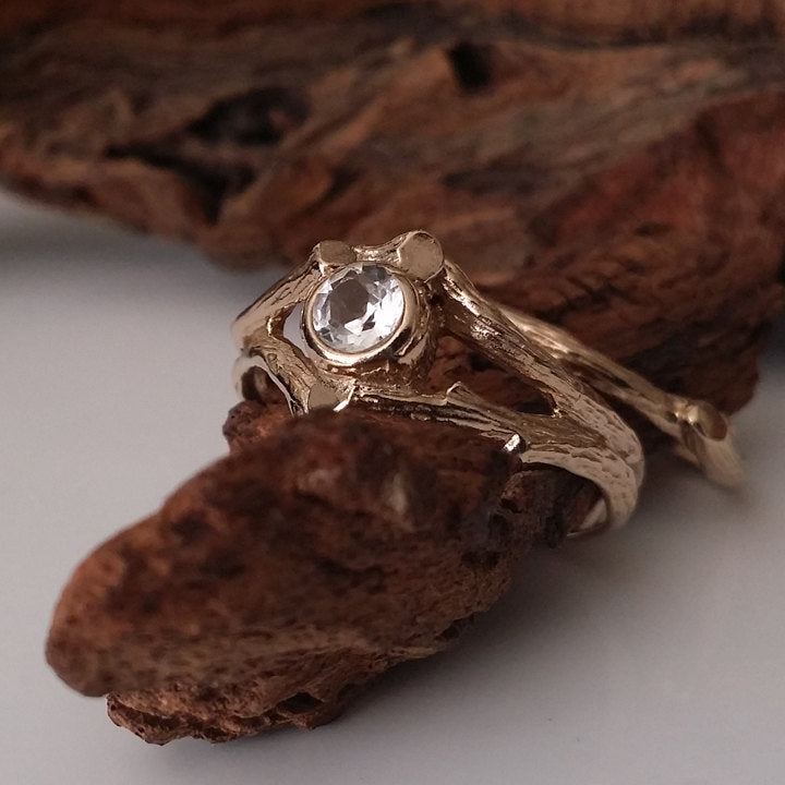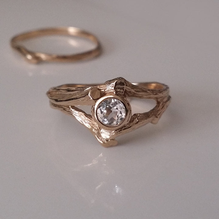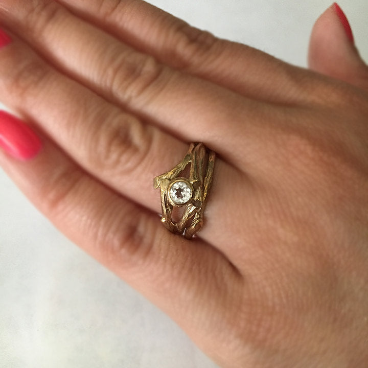 Four Twigs, hand sculpted with a textured bezel nestled between the twigs. The wedding band has two branches coming together which is worn close to the heart.