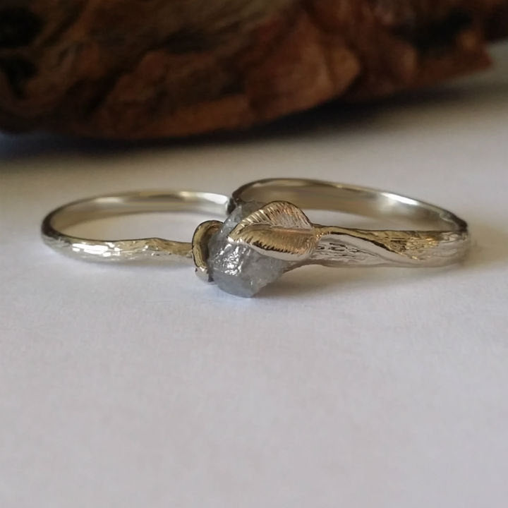 Hand sculpted 14k White Gold Leaf & Twig Bridal Set are hand sculpted and one-of-a-kind creations. Each ring is sculpted by me to fit my hand selected raw uncut diamonds.