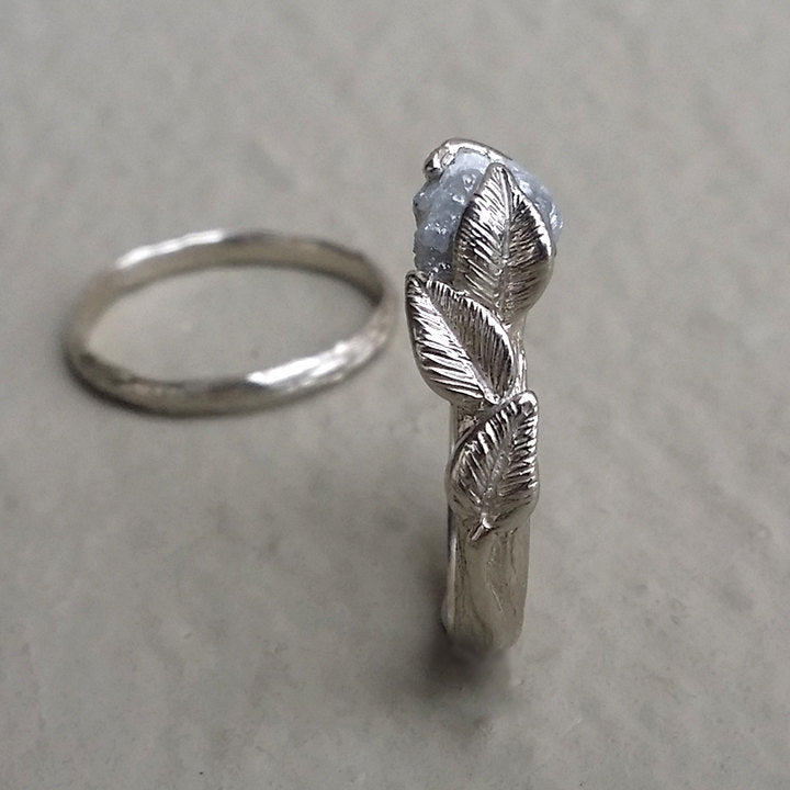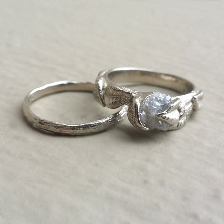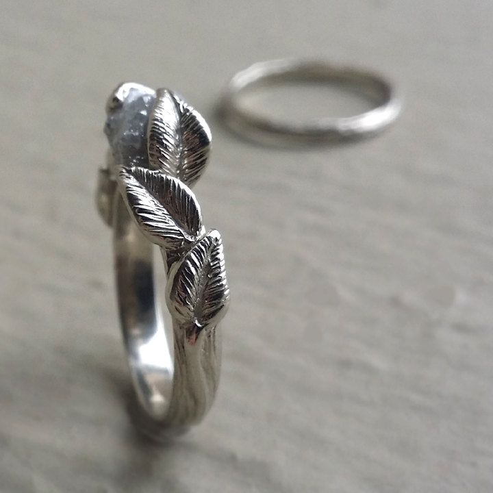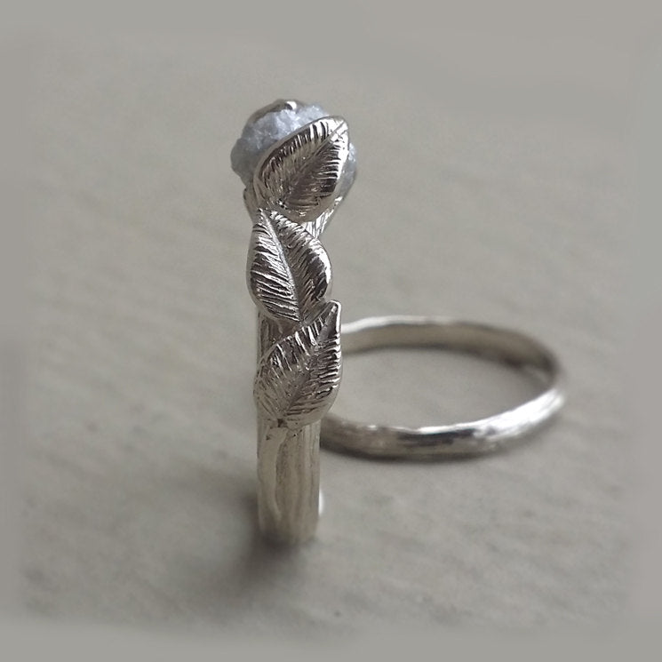 I wanted to create a delicate yet beautiful Leaf and Twig Engagement Ring using an Uncut Raw Diamond, so I sculpted the branch band first and then I hand sculpted 6 natural flowing leaves along with their stems that reach up and embrace the uncut diamond. These are truly elegant wedding rings that will flatter her finger.