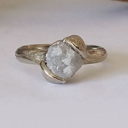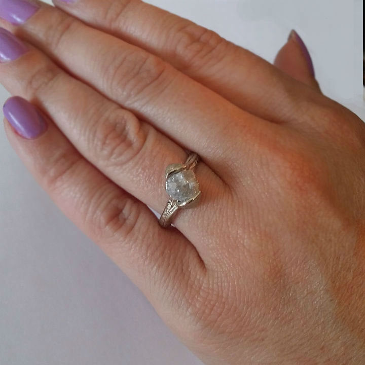 I wanted to create a delicate yet beautiful Leaf and Twig Engagement Ring using an Uncut Raw Diamond, so I sculpted the branch band first and then I hand sculpted two natural flowing leaves along with their stems that embrace the uncut diamond as if it was two hands holding the stone, I was truly impressed myself once completed. These are truly elegant wedding rings that will flatter her finger.