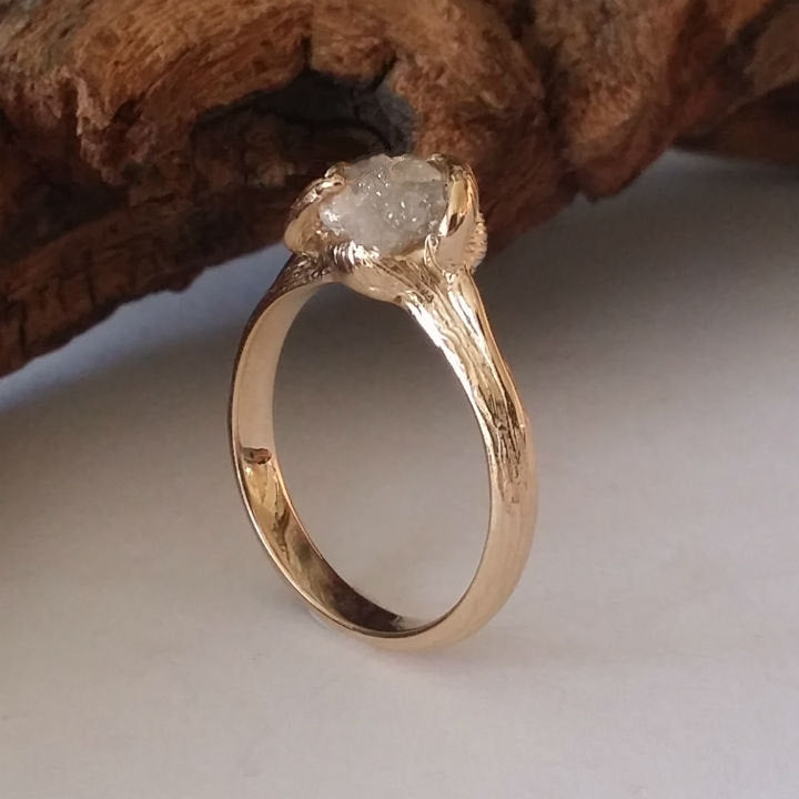 I wanted to create a delicate yet beautiful Leaf and Twig Engagement Ring using an Uncut Raw Diamond, so I sculpted the branch band first and then I hand sculpted two natural flowing leaves along with their stems that embrace the uncut diamond as if it was two hands holding the stone, I was truly impressed myself once completed. These are truly elegant wedding rings that will flatter her finger.