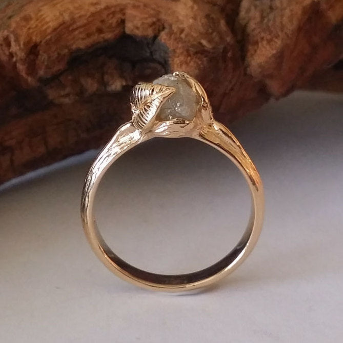Please NOTE: The completed ring in photos has already sold. This listing is to create your own Leaf & Twig Engagement ring in your choice of 14k gold 18k Gold with a white or black raw uncut uncut diamond.