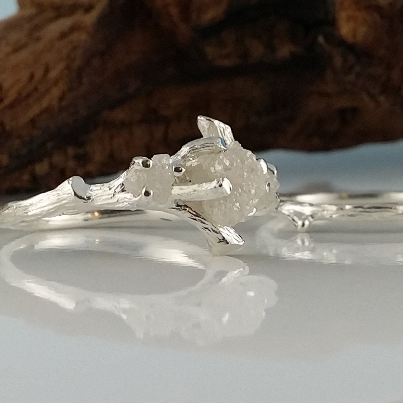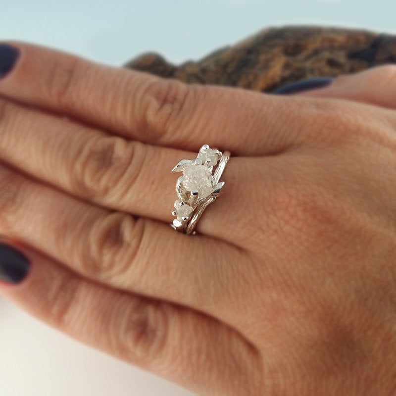 Made-to-Order Custom Twig Bridal Set using Three White Uncut Rough Diamonds set in Gold.